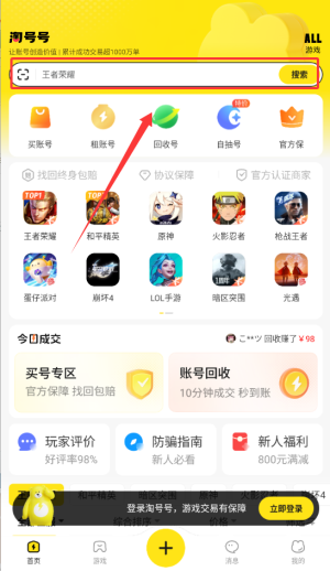 1、进入淘号号app,在置顶输入游戏名然后搜索。