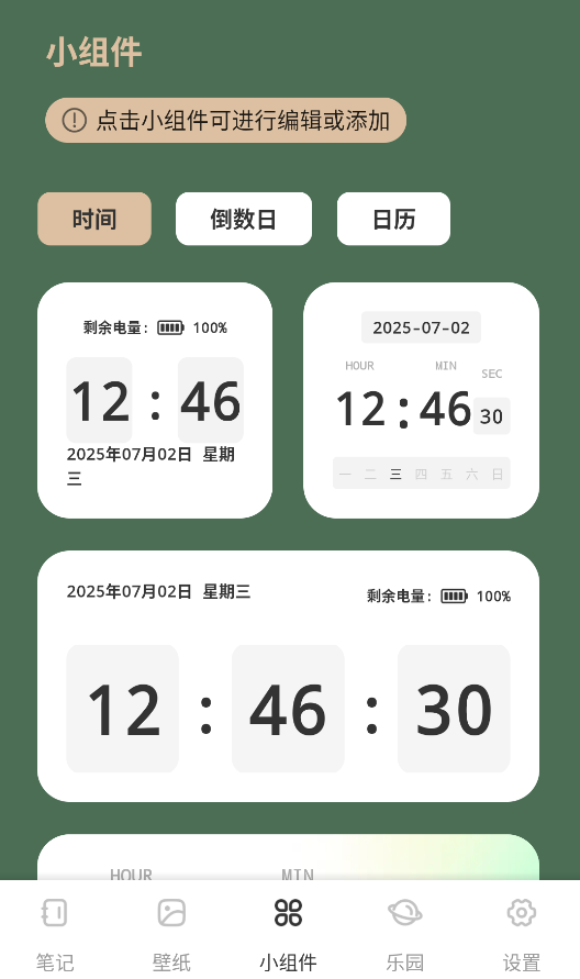 3、小组件库包含时间管理工具(倒计时/日程表)、效率统计图表等,可拖拽至手机桌面实时查看。
