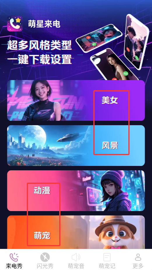 1、海量创意来电秀:收录10000+个精品来电视频,涵盖动漫、明星、萌宠等20+主题分类,每日更新最新内容。