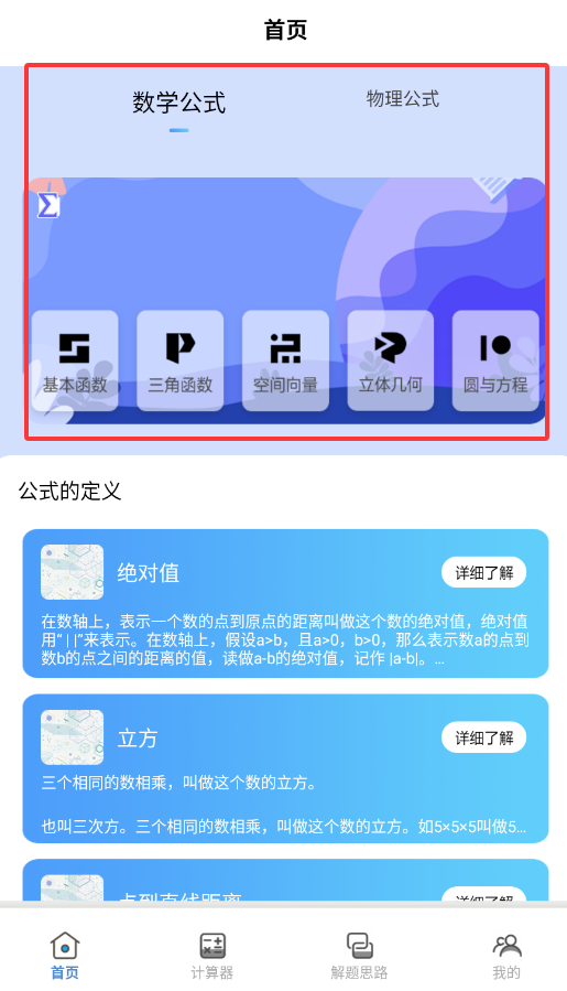 1、进入芬奇计算公式APP,首页展示各类数学公式库,点击即可查看详细解析与应用说明。