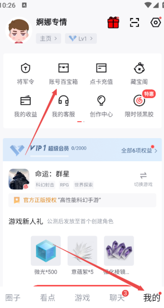 2、在我的页面,选择账号百宝箱,点击进入账号设置界面;