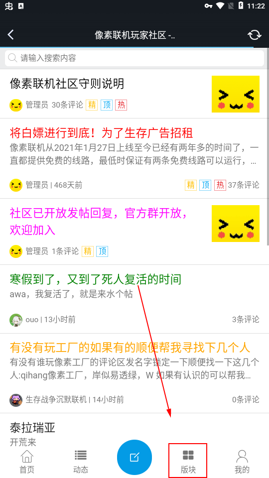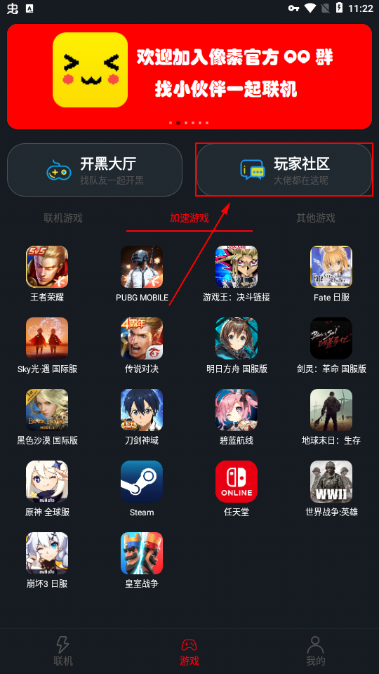 1、下载并点击像素联机2024最新版,点击【玩家社区】