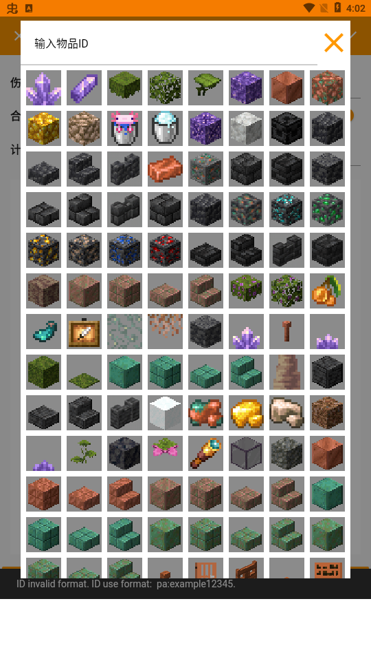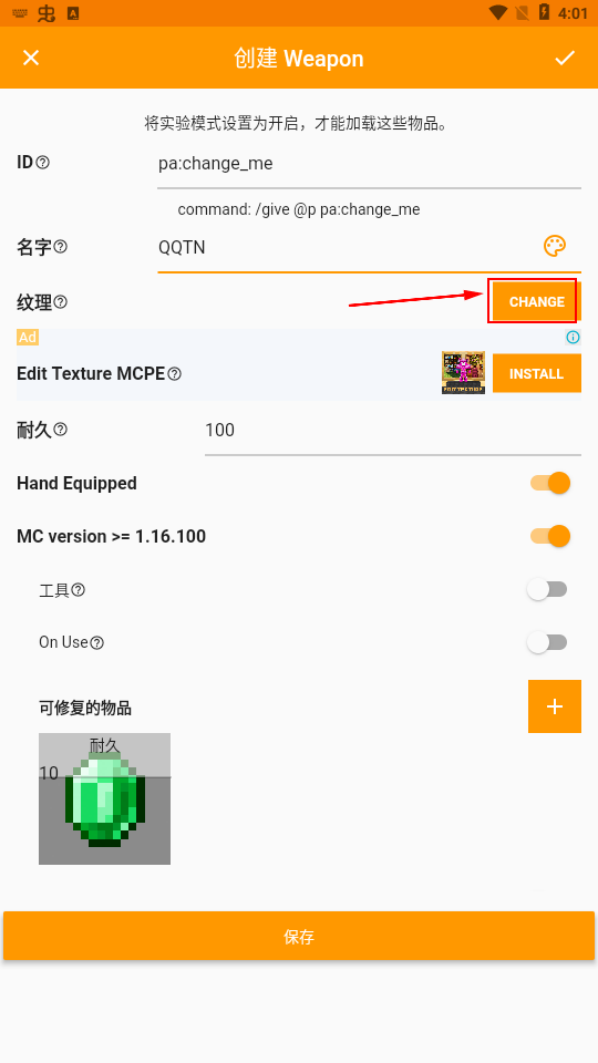 5、选择好物品后进入编辑界面,那个id不用改,名字可以自己随便输入然后点击字多的那个按钮