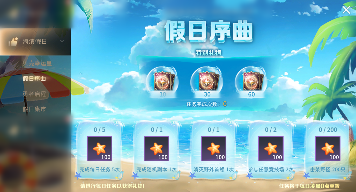 活动期间,完成「海滨假日」系列活跃活动指定任务获得假日积分点,达到指定目标即可领取丰厚奖励!传说精灵卡自选箱、传说召唤兽自选箱、圣核,以及超多养成资源随心兑换!福利真的拿到手软!