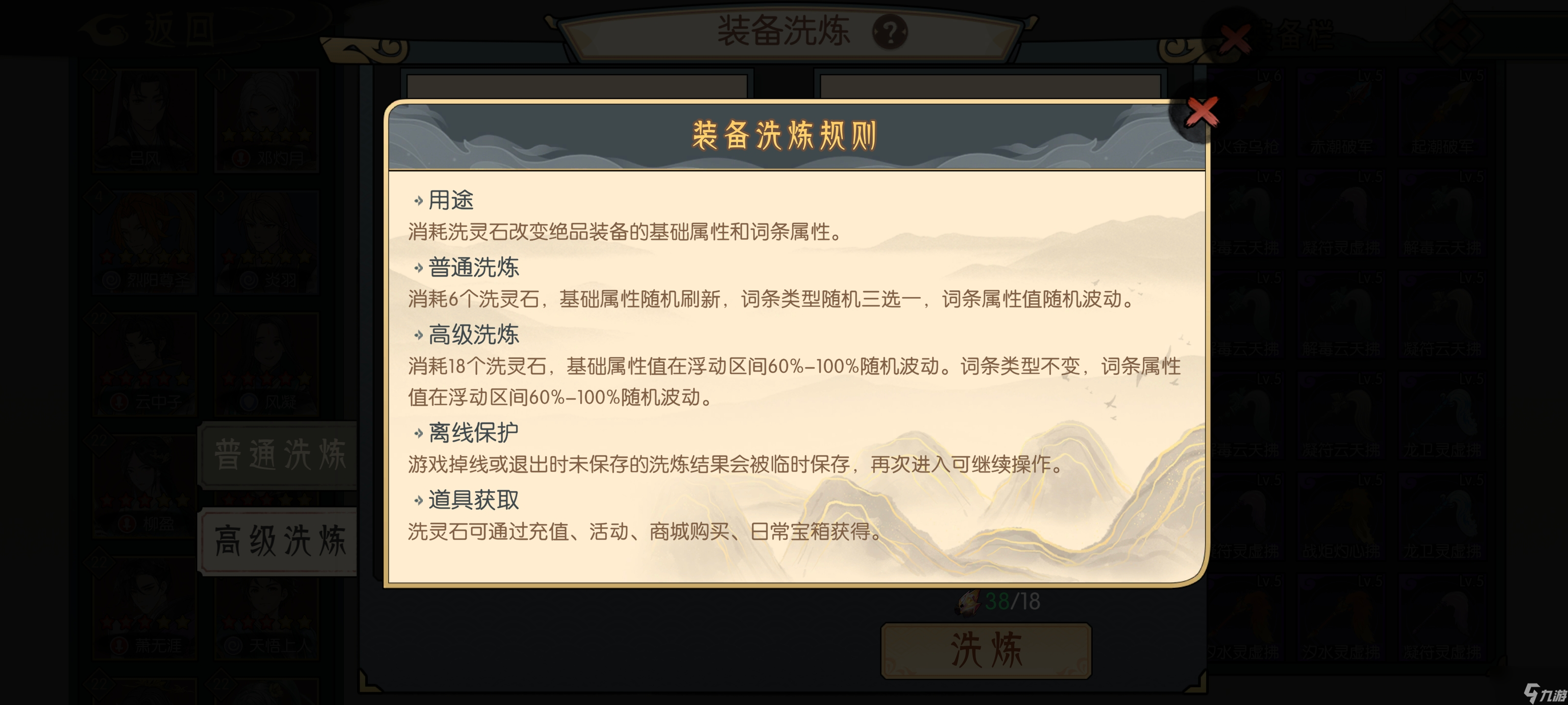 消耗6个洗灵石,基础属性随机刷新,词条类型随机三选一,词条属性值随机波动。
