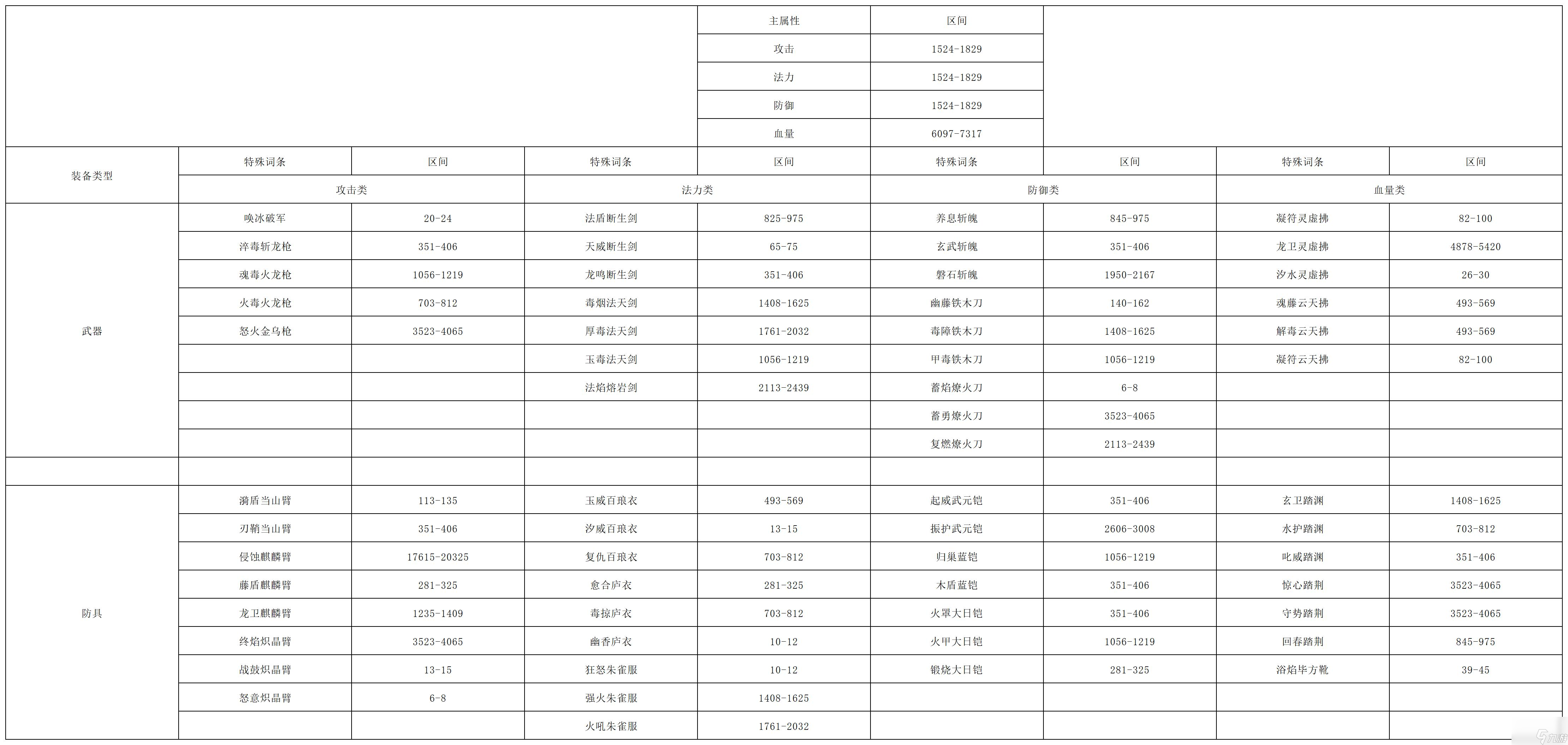 以下是有浮动区间的六阶装备区间数值,其余数值可自行去游戏内查看。