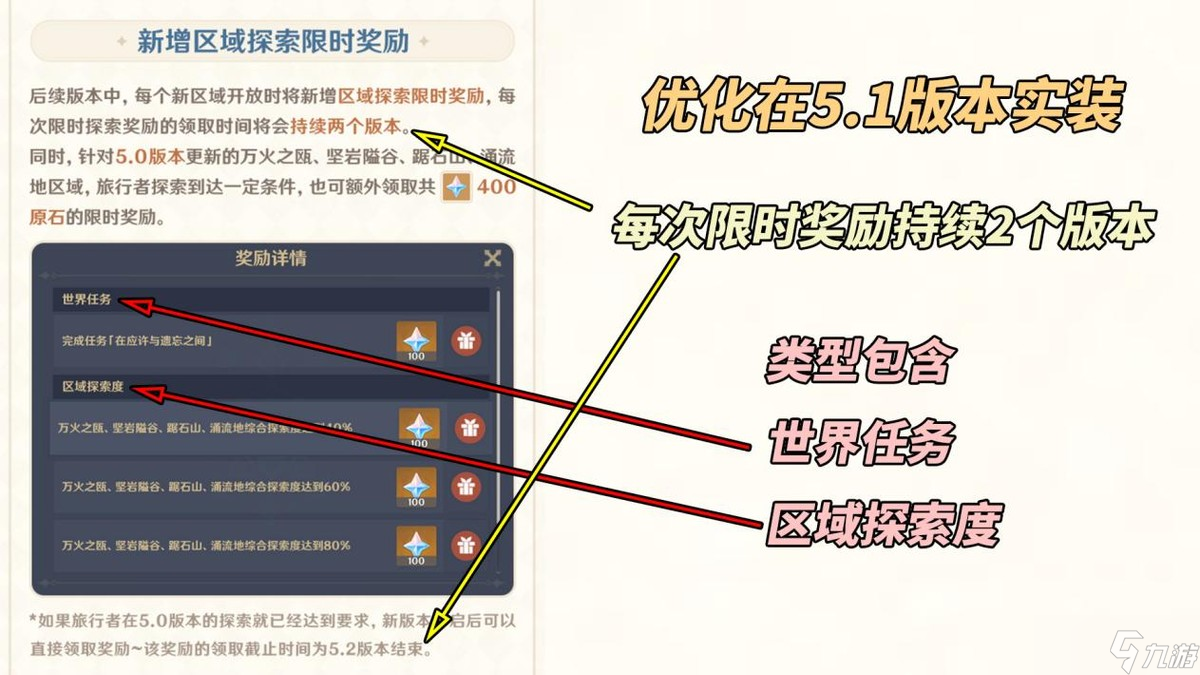 ①探索度鼓励:以5.1为例,在万火之瓯、坚岩隘谷、踞石山、涌流地综合探索度达40%、60%、80%时可分别领取100原石。②世界任务鼓励:对重要的世界任务也增加了100原石奖励!鼓励玩家在探索地图途中,顺带完成相关任务,了解本土风情的同时获取更多原石。