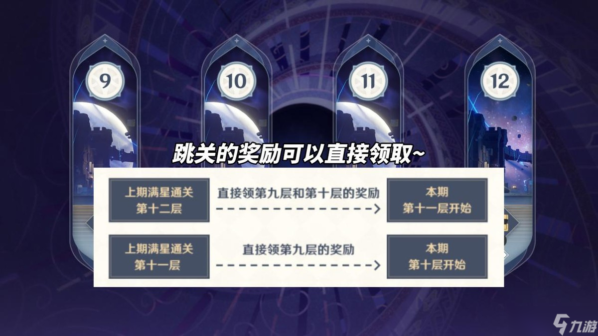 喜,跳关功能终于来啦!从5.1版本最新一期深渊开始,满星12层玩家可以直接从11层开始挑战(满星11层则从第10层开始),跳关奖励在初始回顾弹窗中可以直接领取。非常好优化,这下深渊总耗时又缩短了不少。