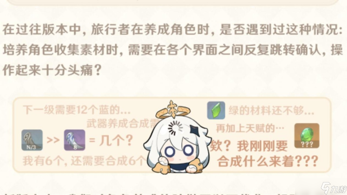 未来培养新角色将会是如此流程:直奔合成台——筛选角色养成目标——点击缺失材料——跳转地图追踪——刷够材料重回合成台。