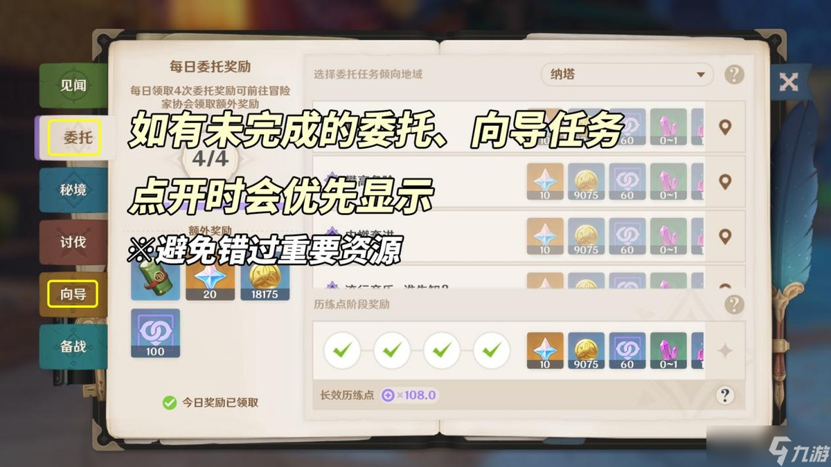 ②冒险之证,优先展示未完成的每日委托与向导任务。