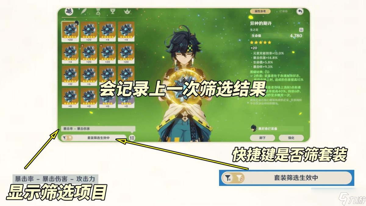 ③圣遗物筛选记忆功能,未来可自定义每个角色的圣遗物筛选方案,会记录你上一次对套装、部位属性等功能的选择,下次进入自动展示结果。并且配合原神的4+1套装规则,增添了快捷关闭套装筛选的功能,在搭配装备时的体验更优~
