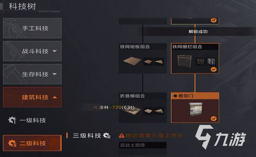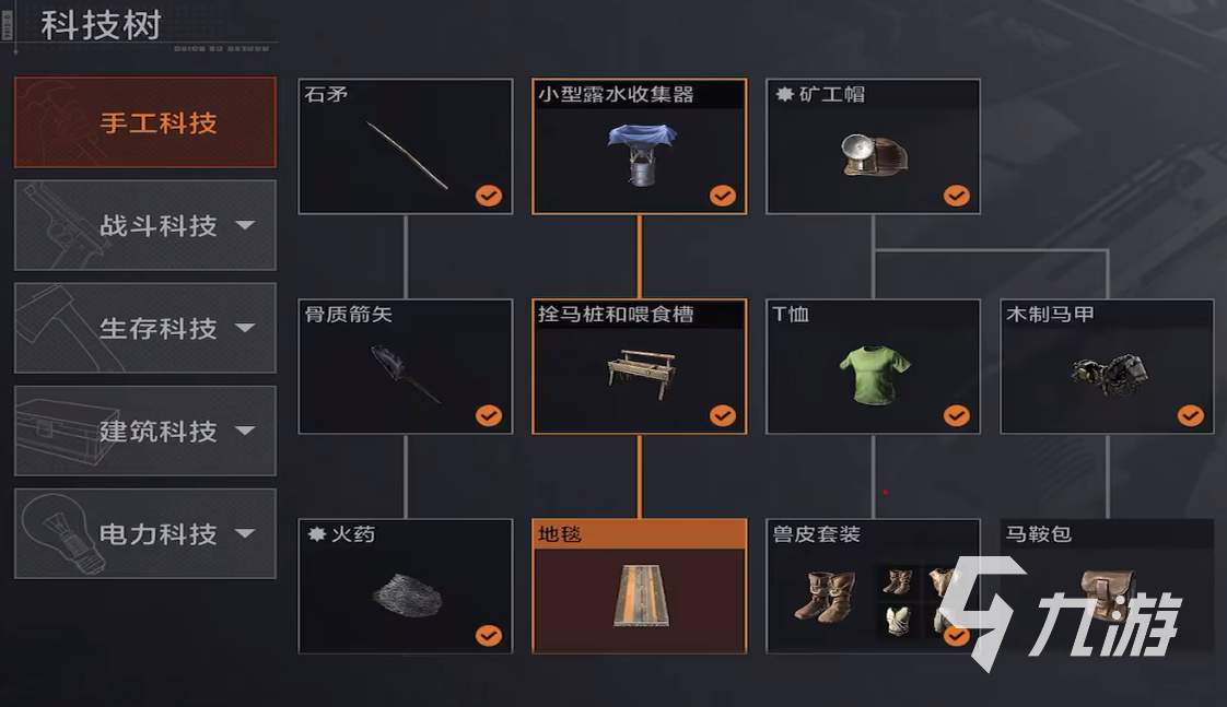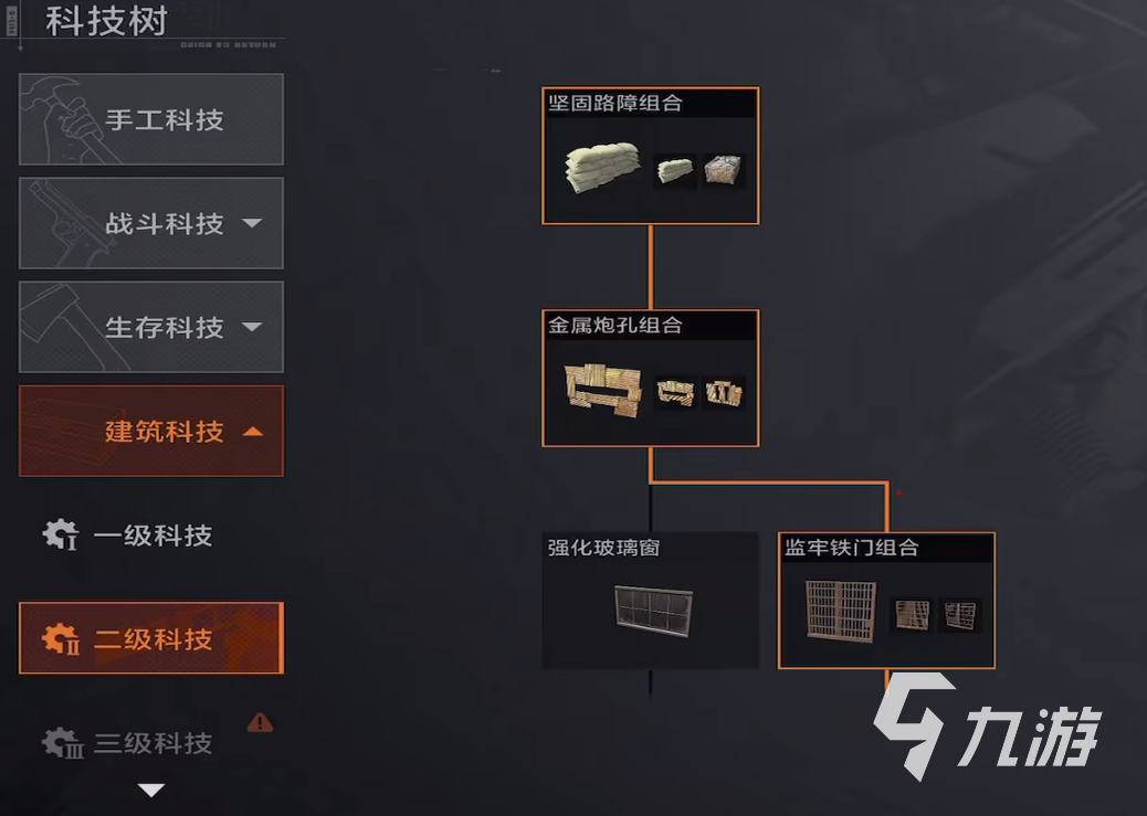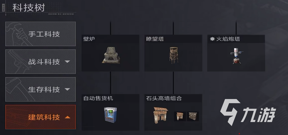 科技树被划分为多个功能模块,涵盖基础建造、防御体系、武器装备以及电力自动化等方向。基础建造用于解锁木材加工与石材处理技术;防御升级则允许玩家建造围墙、设置陷阱或部署炮台以强化据点安全;武器与装备分支支持制作近战兵器、远程射击工具及防护护甲;而电力与自动化科技则通向发电机、自动炮塔等高阶设施的研发。