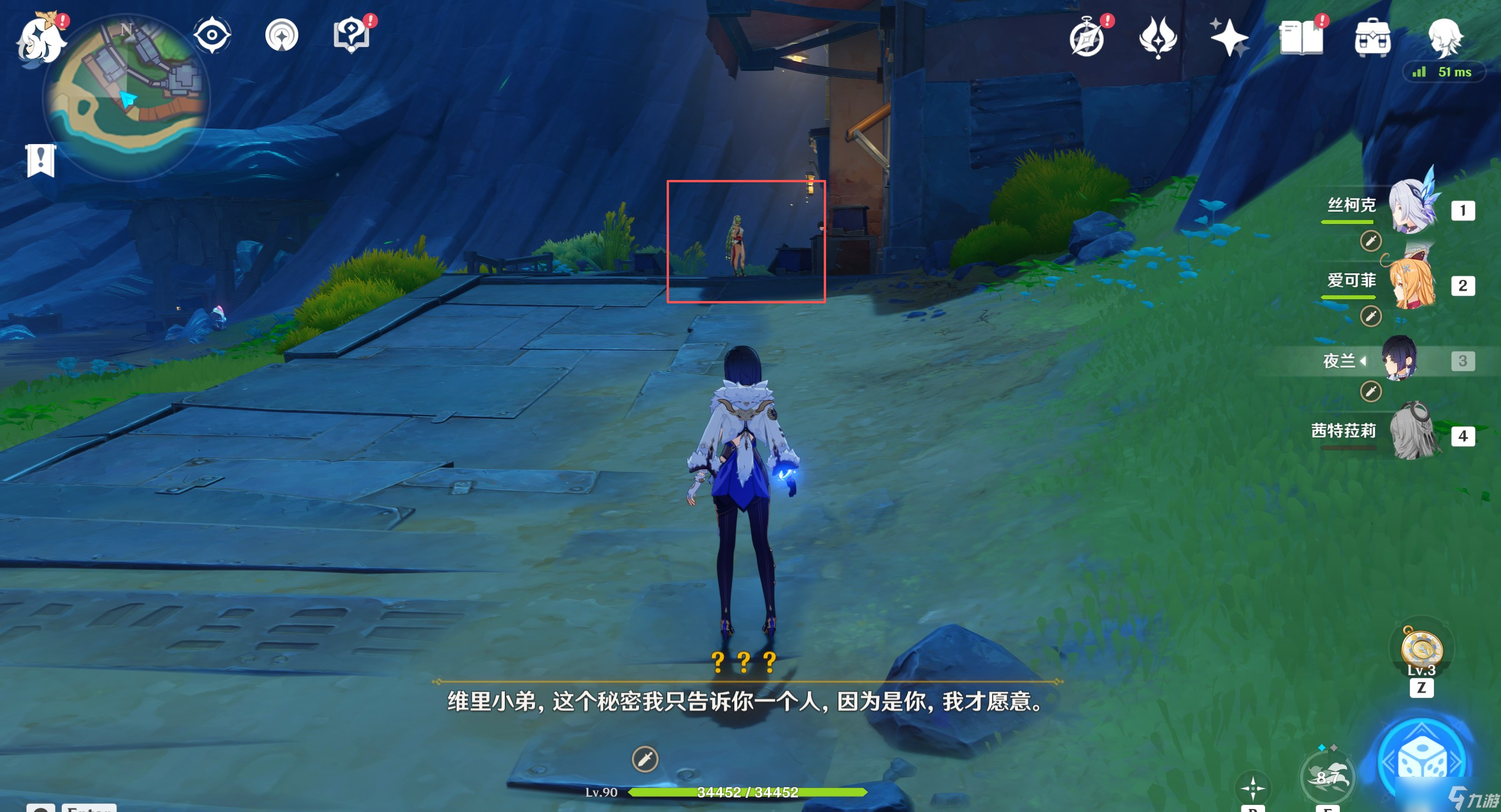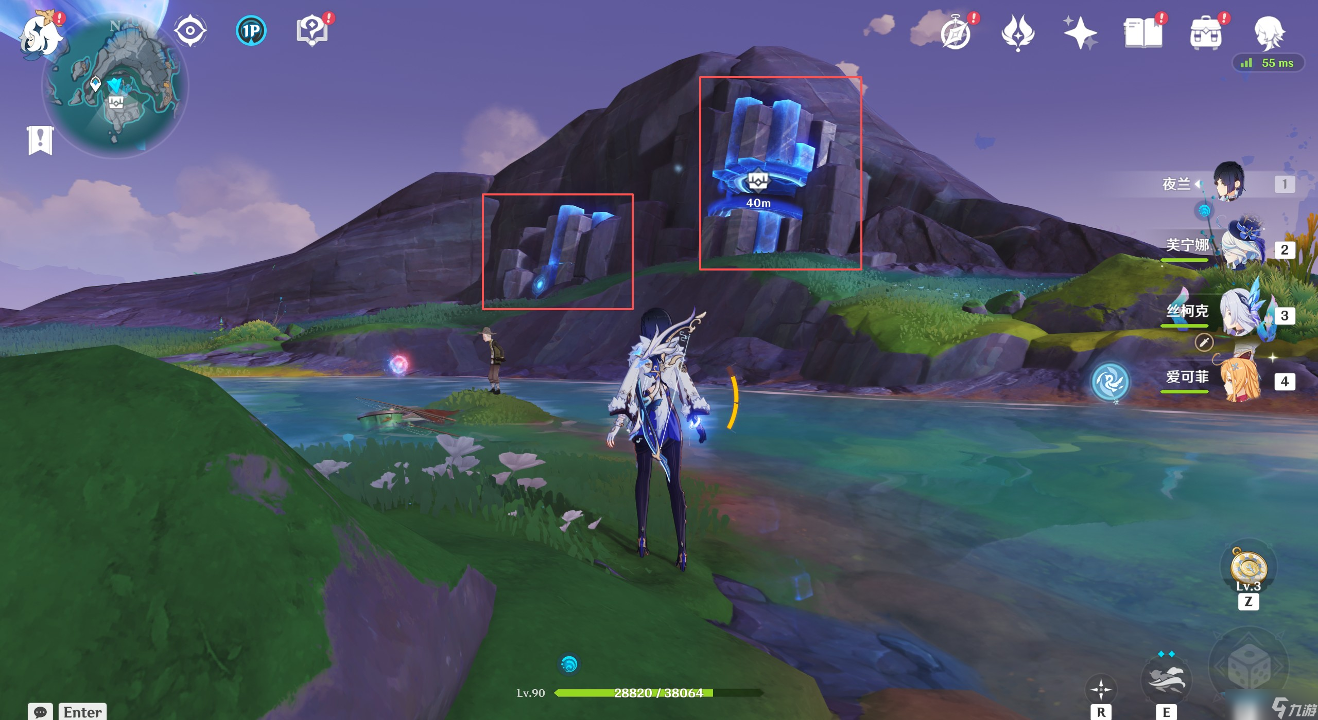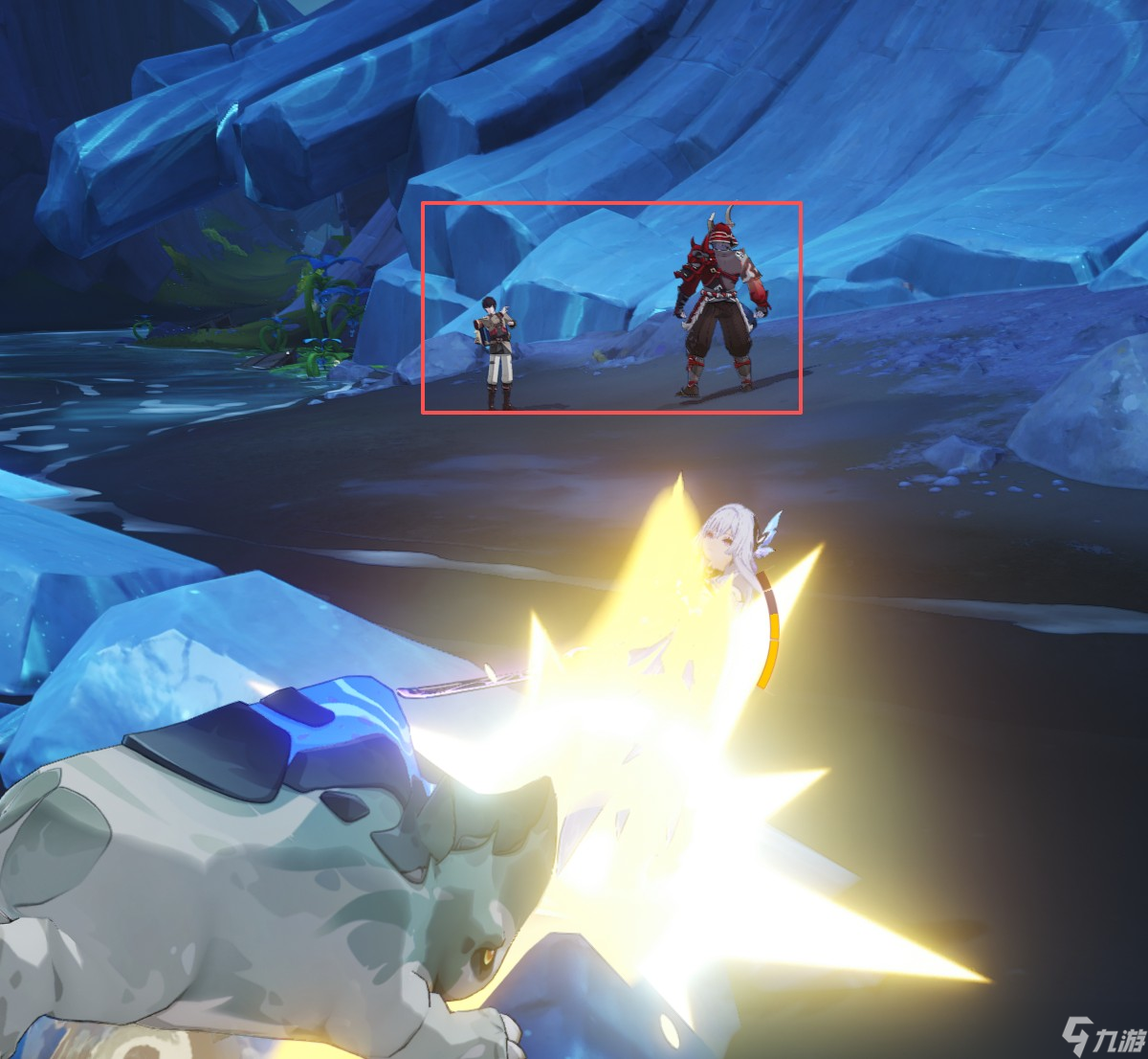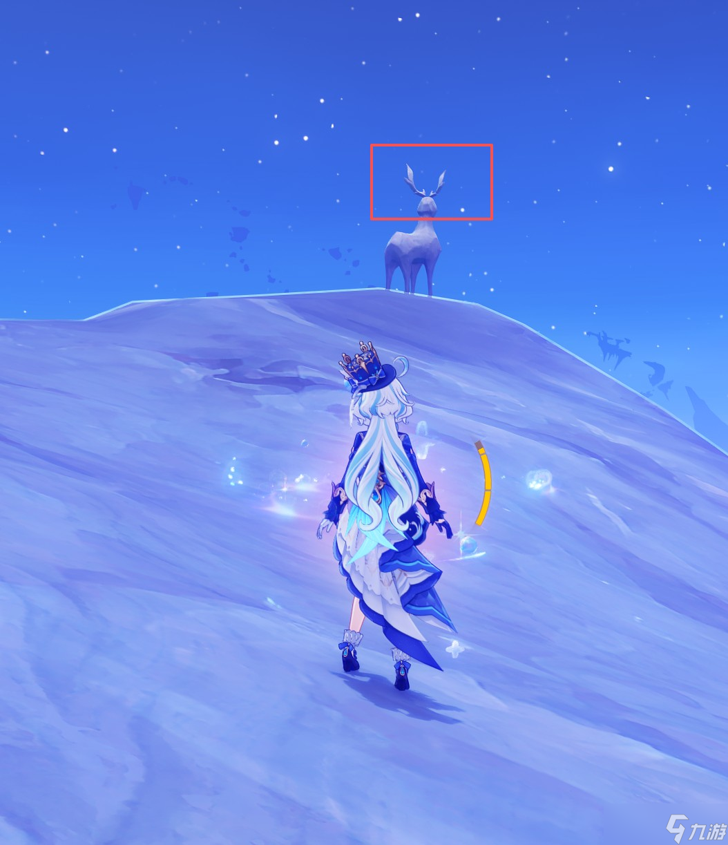 获取方法:这个地方原本是有一个神瞳的,然后小鹿的头上有几个小精灵,接触过之后在图示的身后会出现极光滑轨,上去宝箱就会出现,个华丽宝箱