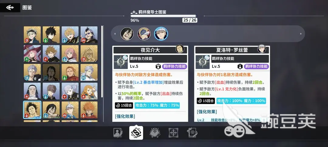 协力技:需要众多回合进行冷却,协同伙伴对1个敌人造成损伤,如果带有持续伤害效果,会给自己附加伤害量增加效果,提高自身输出。觉醒被动,在被动攻击时,有较小概率,给敌人添加全攻击力减少的负面buff。