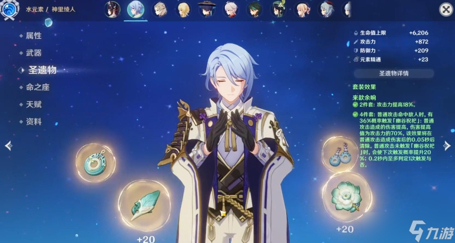 比如说佩戴精一弓藏或者飞雷,由于这两把武器只提供百分之四十的增伤,追忆套属性的增益上升到了百分之二十五,因此对宵宫来说余响套对比追忆的优势就只有不扣除能量。最适合余响套的还是神里绫人,他开启战技后的瞬水剑是视为普攻的能触发余响套,战技的倍率吃生命值加成,零命十级战技将生命倍率折合成攻击倍率的话,整体每刀倍率为百分之一百六十多,余响套的提升率为百分之二十一。