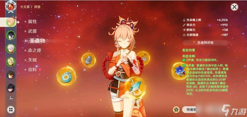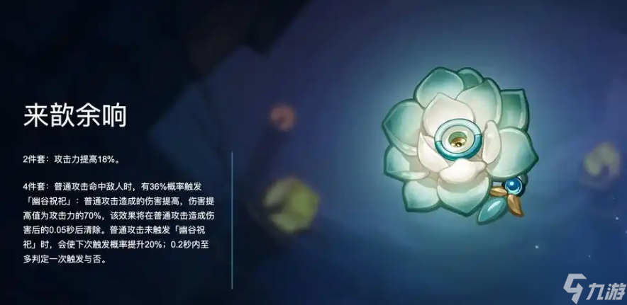 触发一次幽谷祝祀所需要的期望攻击次数为一点九左右,如果攻击间隔大于零点二秒的话,而且普攻次数足够多的情况下,四件套所带来的增益跟每两次普攻增加百分之七十的倍率接近。至于能给角色带来多少伤害提升,需要根据角色普攻倍率和佩戴的武器来定,因为角色普攻越低余响套的收益越大。比如说宵宫携带该套装,宵宫一轮平A有七箭,其中一二箭的间隔大约是零点一秒,四五箭的间隔为零点二五秒,因此对于余响套来说宵宫的有效普攻次数实际为六次,也就是能触发余响套三次。