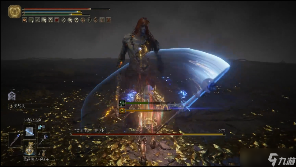 第二阶段通常以 "黄金碎击" 为始:拉达冈飞身跃起后在空中蓄力猛力下砸,产生极大范围的延迟扩散黄金冲击波。这一招的应对方法特殊,需要向拉达冈方向闪避而非远离,否则会被延迟冲击击中。
