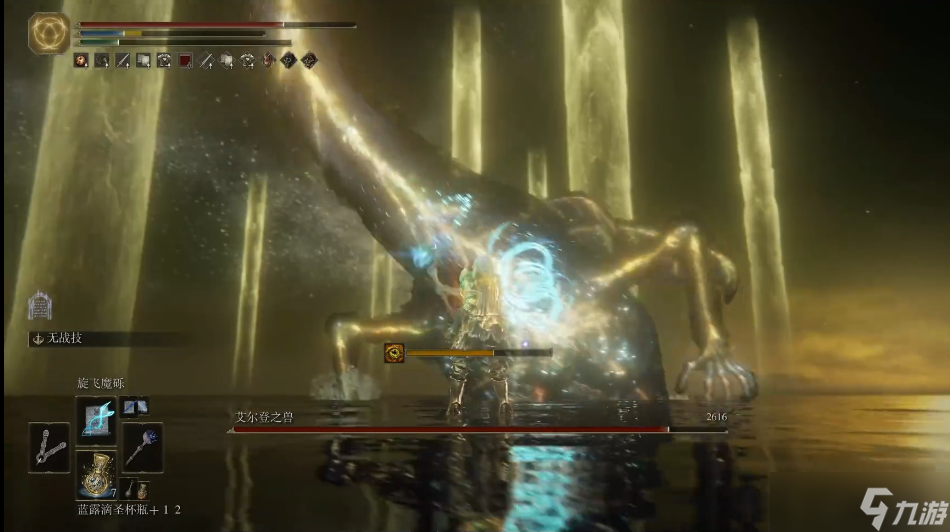 武器选择方面,中期过渡推荐使用卢瑟特的辉石杖,虽然它会增加 50% FP 消耗,但能提供显著的魔法伤害提升。如果 FP 管理有困难,卡利亚权杖也是不错的选择,强化后可达 S 级智力补正,特别适合释放卡利亚系列魔法。左手建议配备 100% 物理防御的盾牌如龟壳盾,在紧急情况下可用于格挡突袭。
