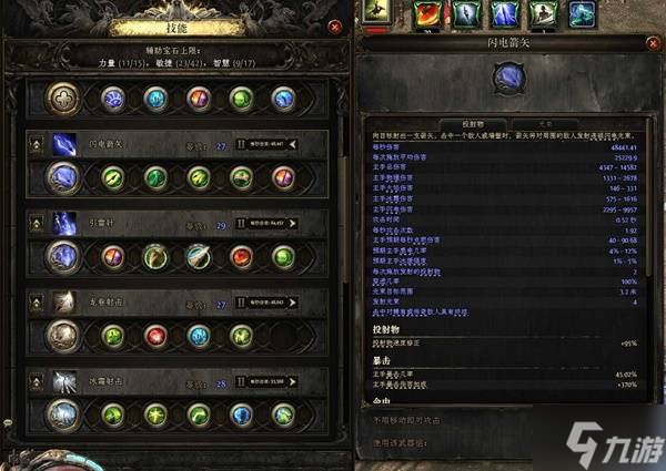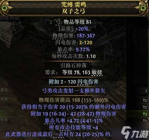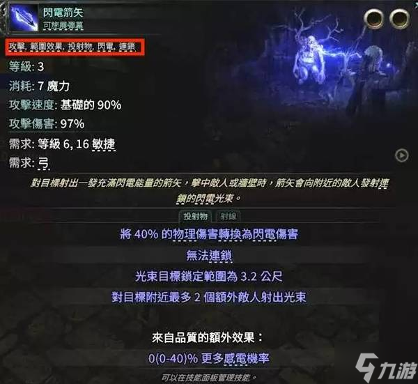 这代表着,闪电箭矢可以吃到攻击,范围,投射物,闪电,连锁这一整类型词缀的伤害增加于额外增加,吃不到法术闪电伤害增加一类,标签有的就能吃到,没有的就不能吃到;同时,限定弓类使用,此技能也能吃到弓类的伤害增加于额外增加