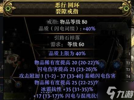 第二步:打满闪电催化剂(搏一搏高t阶电点伤),左旋崇高+催化崇高+强效崇高+完美崇高,这一步只会提高前缀出现电点伤的概率!非必成!好词:t3以上点伤,闪电inc;如果两条都不是好词,戒指可以扔了做下一个了;如果只有一条废词缀,可以左旋精华+深渊精华赌吃掉废词缀,然后上个遗存锁骨 刮好词缀,至此,前缀完成
