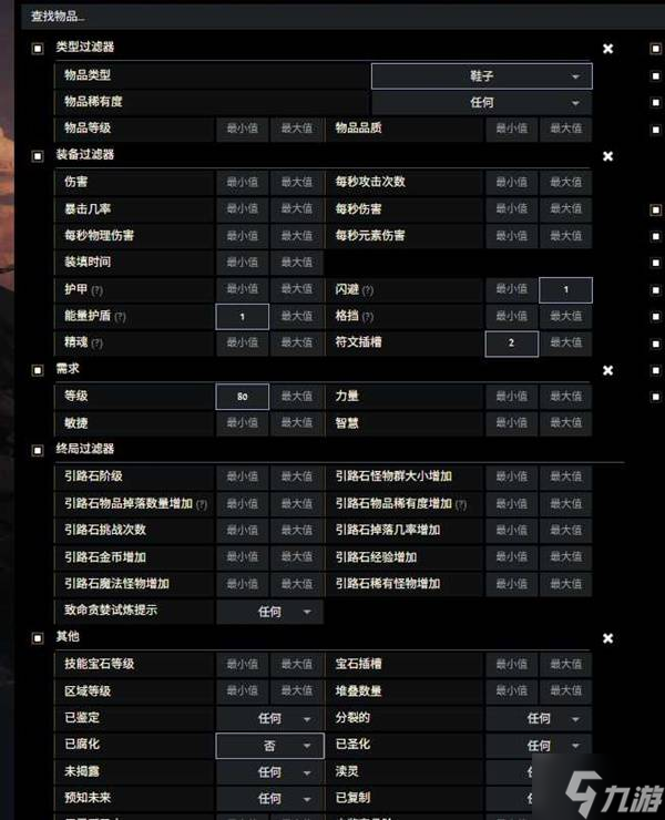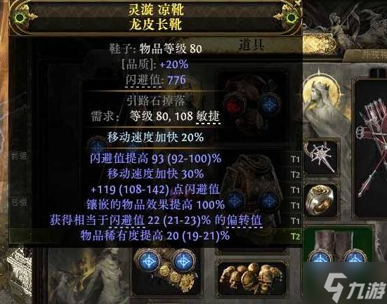 选择 卓越-龙皮长靴,至少俩符文孔位的,如果要做闪盾底材的搜需求等级80然后添加一点能量护盾就行;如果要做35移动速度的需要先锁词35移动速度或者选择82级底材硬e出来35移动速度,我目前掌握的方法不适配