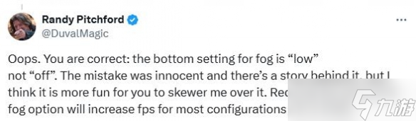 在互动过程中,Pitchford曾向玩家建议关闭游戏中的"雾效"选项以提升帧率,但随后发现该功能实际不存在。他立即修正说法,指出最低设置应为"低"而非"关闭",并解释这一错误系"无心之过"。降低体积雾设置确实可在部分配置下改善性能表现。