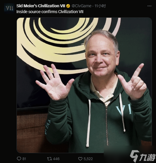 《文明》系列最新作品《文明7》近日正式公布。游戏官方推特发布了一张宣传图片,该系列的创始人席德·梅尔用手比出“7”的手势,为这款新作造势。
