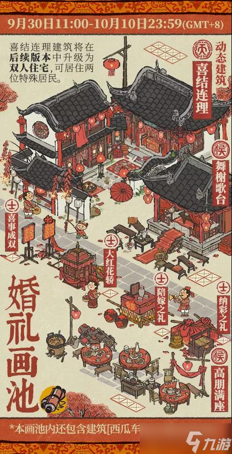 在这浪漫的婚礼画池中,你将邂逅「喜结连理」、「舞榭歌台」、「高朋满座」等多款别具一格的限时活动建筑,每一处都充满了江南水乡的韵味和喜庆氛围。
