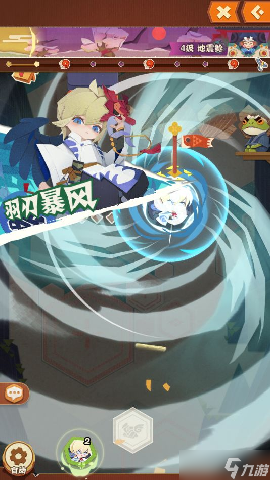 大天狗高速向前撞击,并以自身为中心,制造一个大范围的圆形旋风,因为撞击属性为贯穿,所以这个奥义非常实用。同时奥义在升级到2级后,风车范围将扩大到全场,是非常强力的群攻技能。