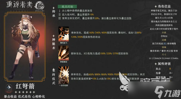 第二位六星角色:红弩箭。这个角色主打一个暴击收益提升,如果你的队伍内有她,那么带一些高暴击伤害的英雄会非常好用。同时这个角色的攻击力是属于S最高级别的。