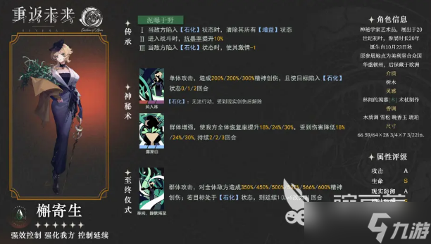 第四位六星角色:榭寄生。这个角色的定位是强力的控制,可以说一旦给他打出一轮控制,后续控制时间会相当长,还有一个很厉害的给石化效果的被动,可以说是比较强力的一个角色。
