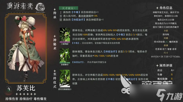 第五位六星角色:苏芙比。这个角色也是主打一个治疗以及强化队友,还有给敌方造成中毒效果的功能,这点在其他卡牌身上是比较少见的。这种给队友加血的buff以及给敌方中毒的效果搭配起来非常不错,很能恶心对手。