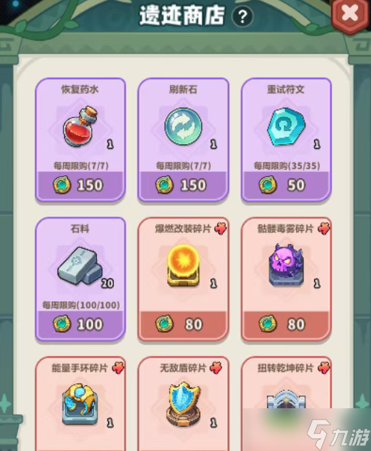 6、遗迹币可在遗迹商店兑换已获得的指定机关、恢复药水、恢复失败次数的道具等等,每周前几次机关兑换享有较低折扣。