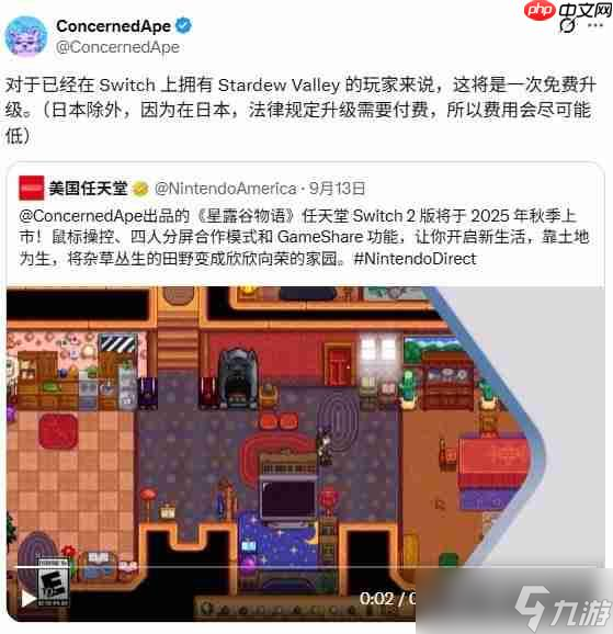游戏制作人ConcernedApe在社交媒体明确表示,已持有Switch原版《星露谷物语》的玩家可免费获得升级版本。需要注意的是,由于日本法律规定,该版本在日本必须收取最低限度的费用。