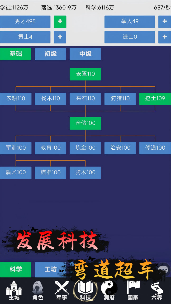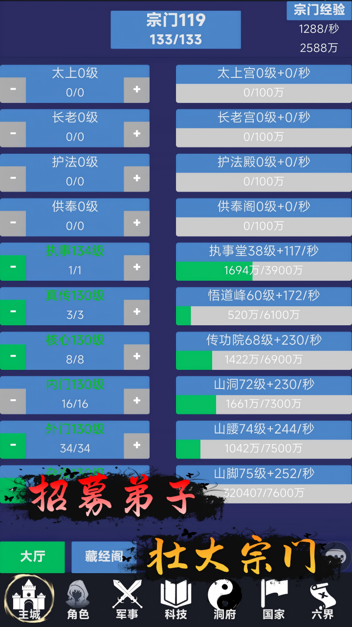 一个融合竖屏修仙与文明进化的放置类文字游戏。【主城经营】在主城建设农田、房屋,产出粮食、吸引人口,分配人口至林场、石矿、猎场、土矿、军营、学院、金矿、衙门、道观工作,增加相应基础资源产出。【宗门壮大】建设宗门后,可招募弟子、建设后山,弟子持续产出经脉经验,升级奇经八脉、激活血脉、突破神通。【角色养成】包括主角、道侣、伙伴、法宝,可锻造神装、解锁技能、升星法宝,提高战力。【军事管理】新兵通过战斗可激活军职并进阶为初级、中级、高级士兵,通过探索闯关挑战各具特色的首领、BOSS,获得领地和声望。【开辟洞府】随着文明的发展,你将开启修仙之路,灵田建设灵府、灵药炼制丹药、灵气升级八卦、灵晶锻造法宝、灵液淬炼肉身、灵果喂养灵兽、灵魂六道轮回。【科技工坊】科技才是第一生产力,科举选中的学徒可进阶为秀才、举人、贡士、进士,研究科技助力文明腾飞,科举落选的学徒形成生产力,分配至工坊生产高级资源,文明从此不再单调。【国家内政】建立国家,升级皇宫,发布内政,开疆拓土,基础资源从此稳定了。【六界争霸】人界、妖界、冥界、魔界、仙界、神界,自由加入,阵营联机对抗。【无尽虚空】青龙、白虎、朱雀、玄武四象,玩家之间争夺土地,奖励重新分配。欢迎大家提出建议,我会认真倾听并持续优化。