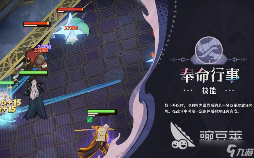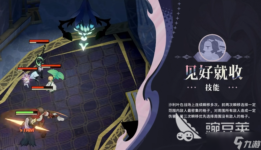 游戏里这个角色有4个技能,其中三个技能是常规技能,另外一个是必杀技,第一个技能叫见好就收,使用之后角色就能在场上不断瞬移,一般前几次瞬移,都会移动到敌人多的格子位置,移到了这里之后可以对周围的敌人带来一定的伤害,等第三次就会瞬移到没有敌人的格子,这就等于在游戏里,角色能通过移动的方式攻击对方,同时又可以通过瞬移离开当前的位置,既能打击对手又能避免对手反击,角色的二技能叫奉命行事,这是一个独特的技能,主打的不是战斗,而是可以在对战的时候,给其他的成员先发任务牌,只要在战斗的时候能达成任务,那角色就能恢复能量,提升战斗力。
