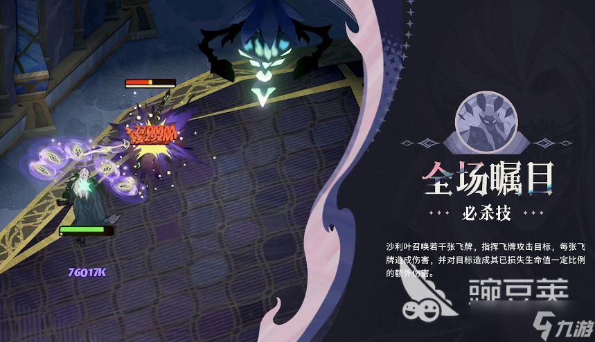 第三个技能名叫专属技能,这个技能名叫幕后支援,三技能和一技能是相联合的,使用一技能攻击之后,角色可以直接点击三技能,所有完成任务的队友和角色自己,都能获得攻击力的提升,估计速度也会变得更加优秀,这项技能等于额外增加了角色的能力,再用技能输出的时候战斗力就会更优秀,角色还有一个叫全场瞩目的必杀技,使用之后可以召唤出大量卡牌,卡牌会飞出去攻击目标角色,每个卡牌都能给对方带来伤害,在攻击的过程中可以实现群体攻击。