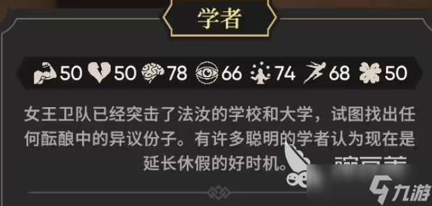 除了对数值属性的一些要求,还需要考虑更多,仅仅将属性积累在一起并创建不了一个强大的队伍,因为游戏的机制中它会有专注度的存在,并且技能会因为专注度的降低而可能减低成功释放的概率,所以还需要角色的特殊能力,学者显而易见就是这个拥有着特殊能力的角色,它本身自带凝神专注的技能,可以极大程度上的增加技能成功的概率,除此之外它还有一定的辅助能力能够为队友提供回复,另一个角色选择猎人,他的属性不仅高他本身输出的数据也非常突出,并且还配备弓箭,完全可以担当队伍中的输出角色,而第三个也是玩家们最不能少的吟游诗人,吟游诗人的被动技能可以将所有的判定都变成完美,让整体队伍实力更上一层楼,他的辅助可以说是所有角色中都无可替代的。