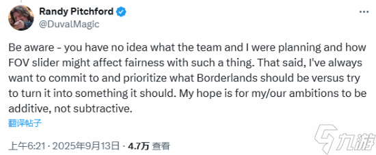 Randy Pitchford补充道:“需要说明的是,你并不了解团队和我之前的规划,也不清楚FOV滑块在此类设定中对公平性可能产生的影响。但有一点始终未变:我一直致力于坚守《无主之地》应有的特质并以此作为优先考量,而非试图将其改造成背离本质的作品。我期望我们的创意抱负能为游戏增色,而不是减分。”
