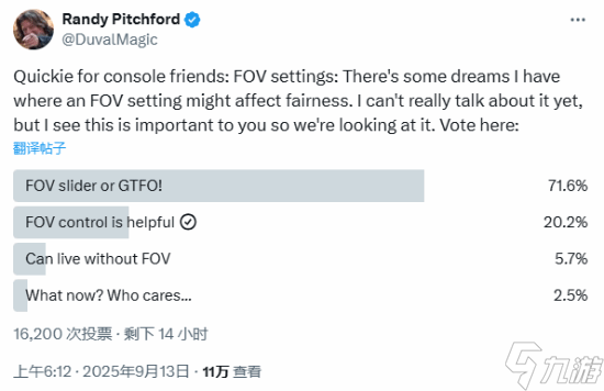 对此,Gearbox的首席执行官Randy Pitchford日前开启了一次投票活动,说道:“关于主机版FOV的设置,我们曾考虑过某些情况下FOV设置可能影响游戏的公平性,但目前不便详谈。我明白这对大家很重要,团队正在积极评估此事。”