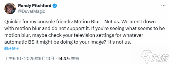 除此之外,Randy Pitchford还谈到了《无主之地4》的运动模糊问题:“主机玩家们,动态模糊跟我们无关,我们不搞动态模糊也不支持这功能。如果你看到类似动态模糊的效果,建议检查电视设置里可能自动开启的图像处理功能,这真不是我们干的。”
