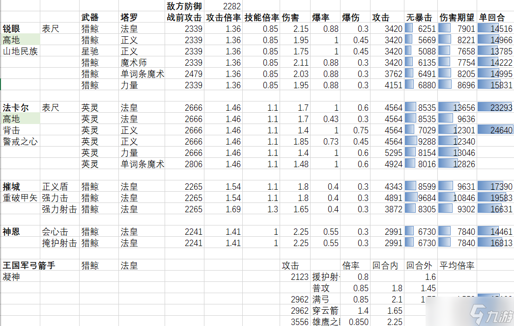 于是,笔者对于几个平民角色的伤害进行了计算,练度参考笔者自己的情况,角色包括法卡尔、锐眼、摧城、神恩、王国军弓箭手,(神恩没学掩护射击,法卡尔60级12阶,锐眼、摧城、神恩55级10阶,王国军弓箭手55级7阶)。考虑小索的窥破弱点增攻,守望者天赋的增攻增伤,刻印双权杖刷出的攻击2,暴击2,铃兰战旗增攻,武器塔罗增伤等,未计算英灵长弓和审判,单回合输出以主动攻击+王牌指令援护计算,计算过程及结果如图所示。