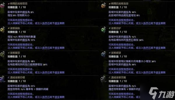 ·涂油词缀:通过迷雾掉落的物品,可以给项链添加上一个角色天赋盘上的大天赋点,具体的涂油组合,可以在游戏中按住alt查看对应的天赋点即显示