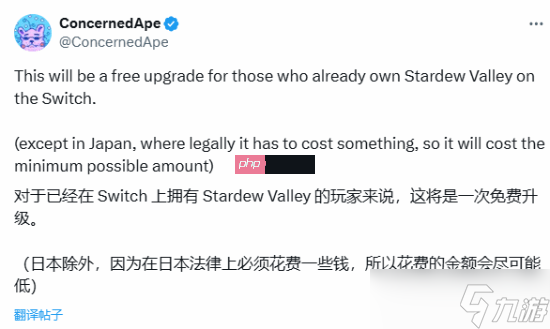 ConcernedApe表示:“原本希望全球玩家都能免费升级,但日本的相关法律要求必须收取一定费用。未来我可能会为日本玩家准备一些特别回馈作为补偿。”