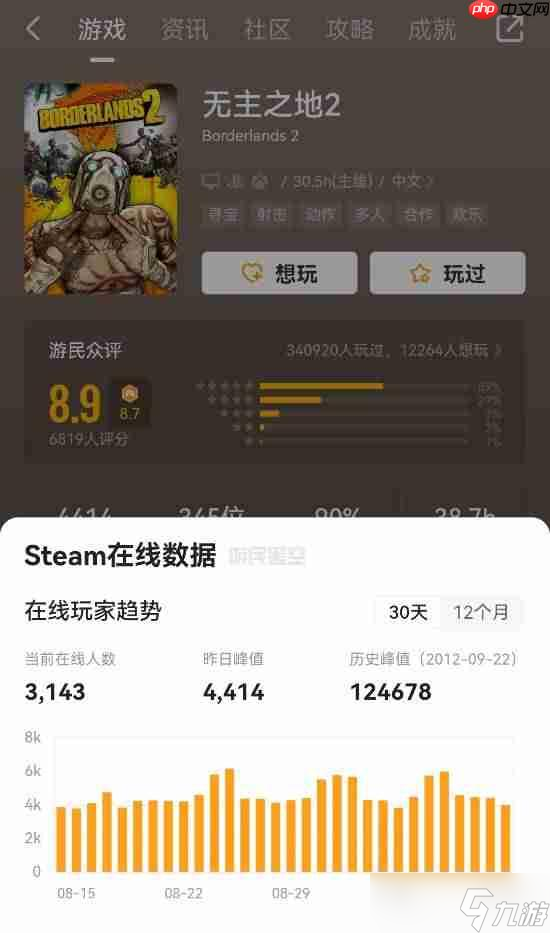 截至本文发布,根据星空数据显示,在历代《无主之地》作品中,Steam 同时在线人数最高的是《无主之地2》,峰值达到 124,678 人。