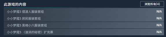 游戏《小小梦魇3》三个dlc分别是:包含2篇额外的章节|摆渡人服装套组的漩涡的秘密扩充票,包含4套基于前作中“居民”设计服装居民服装套组,和预购特典服装黑暗小六服装套组。