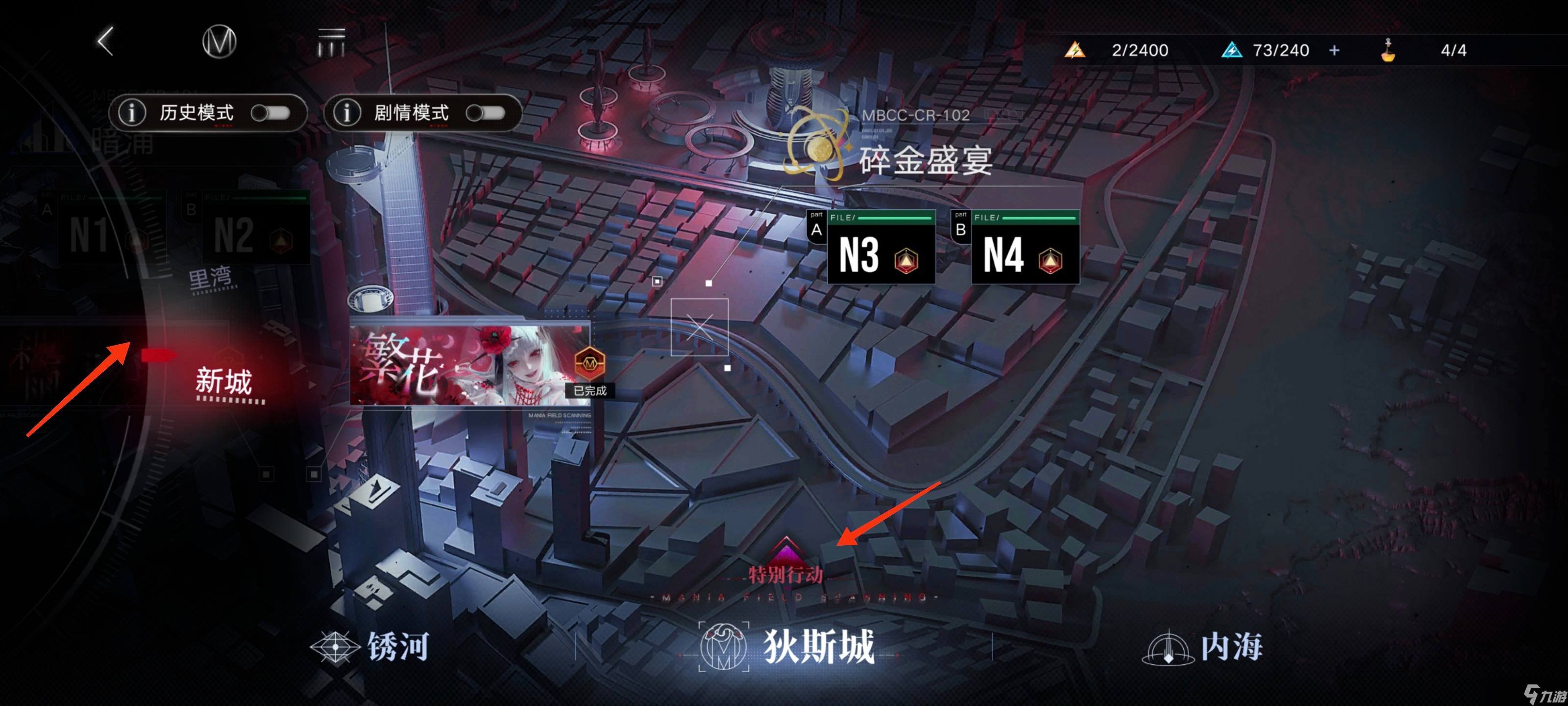 “狄斯城”:主线关卡及部分活动关卡;主线通关8-9之后解锁“历史模式”与“剧情模式”