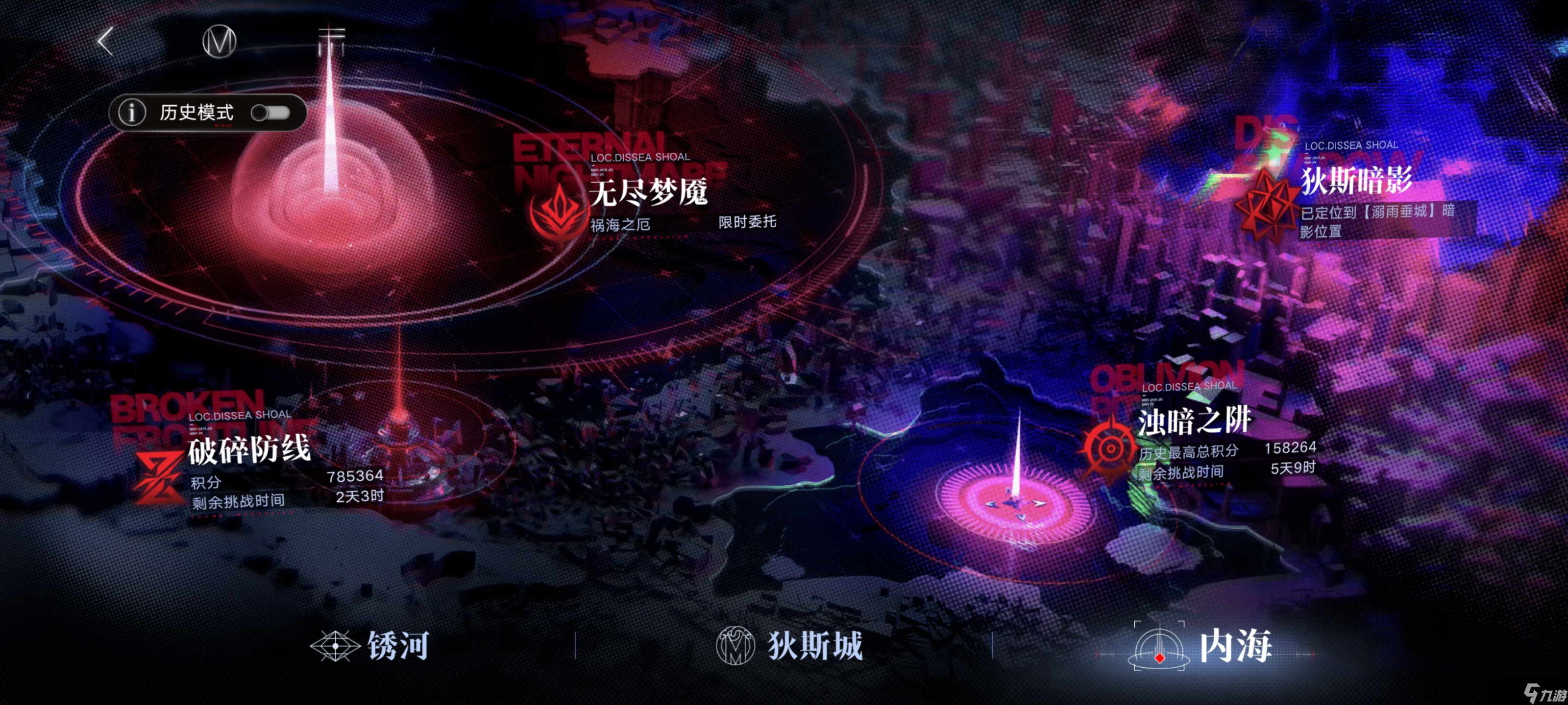 “内海”:定期更新与不定期更新副本;包括“狂厄特训”、“数据间隙”、“破碎防线”、“无尽梦魇”、“浊暗之阱”、“狄斯暗影”