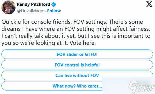 Pitchford在X平台发起的相关投票显示,超过1.9万名参与者中91.7%支持添加该功能,仅8.3%表示无所谓。但他在推文中透露:"某些开发构想中FOV设置可能影响公平性,目前虽无法详述,但我们已高度重视此需求。"这番涉及"公平性"的表态可能暗示多人模式相关机制,但当前游戏路线图中并未提及相关内容,且PC版现有FOV功能也未引发公平性质疑。
