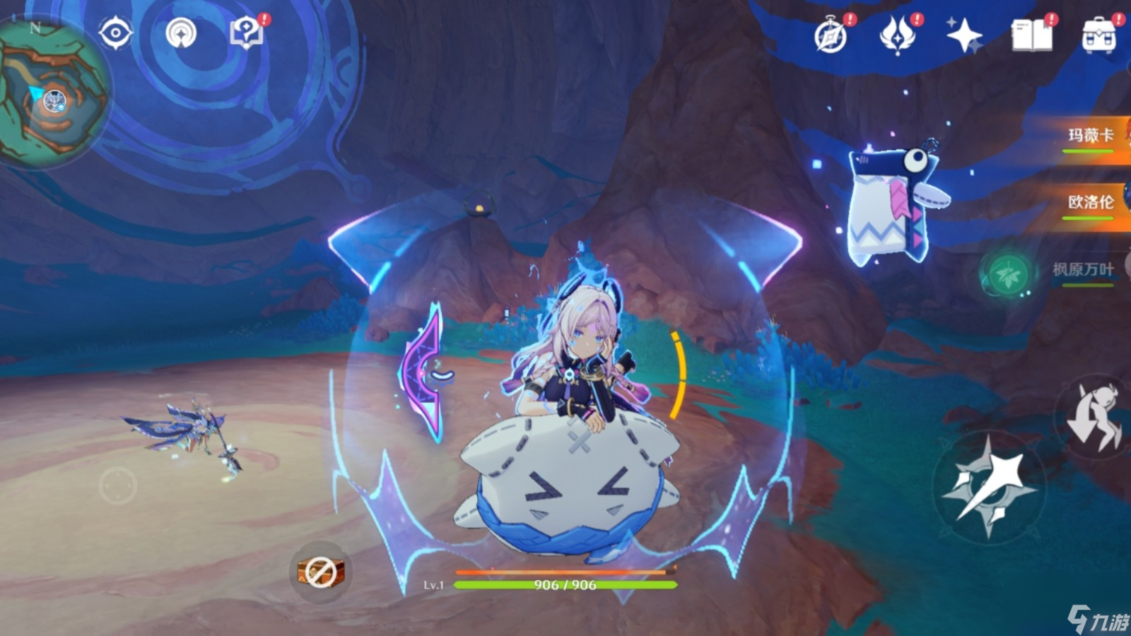 护盾由点按E开启,E技能cd十六秒,持续时间二十秒,和钟离一样。开盾瞬间会给自己挂一次极为短暂的弱冰附着,由于元素量极少,和身上的水元素反应后,并不是把自身冻住。护盾量基于元素精通加固定数值,同为零命情况下,根据携带武器的不同,护盾量约为钟离的五到六成。作为冰系角色,在吸收冰伤方面,护盾量会提升到原护盾的250%。使用E展开护盾的同时,还会召唤帕帕跟随角色二十秒,就是角色右上角的小可爱。召唤瞬间还会有一段伤害,范围还挺大的,站在场地中间能打到五只怪。且这段有元素附着,为独立弱冰。